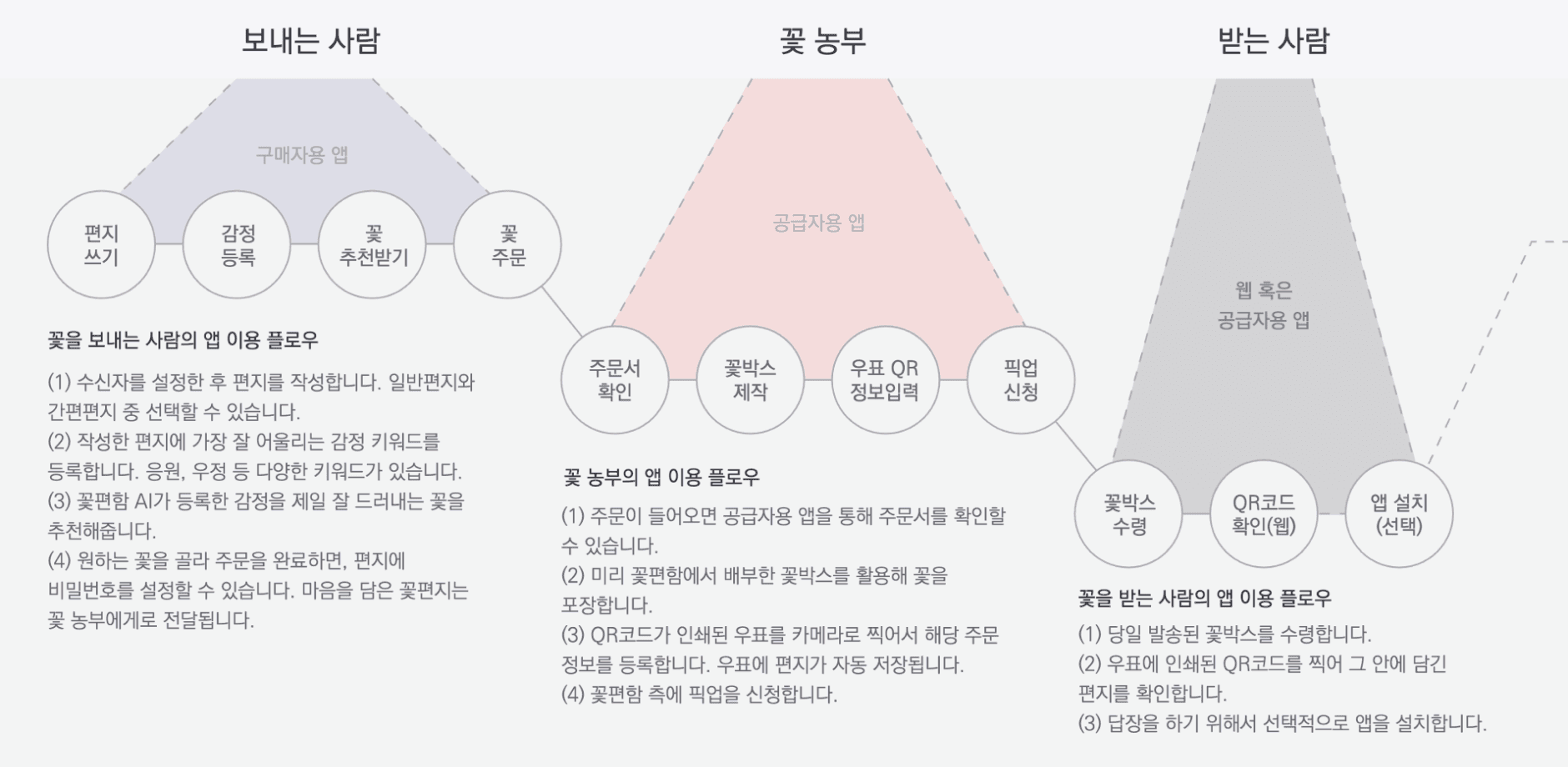 FlowerPost is designed as a three-sided service ecosystem, connecting the sender, flower farmer, and receiver through a single emotional flow.